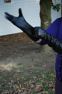 I’m wearing a purple cardigan with crystal buttons from New York & Co. over a black camisole and a purple tweed skirt from Target. The heels are the same Target peep-toes from earlier in the week (lazy me!) and elbow-length gloves pushed down to tea length.
