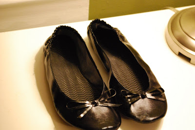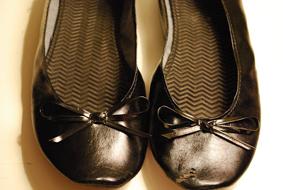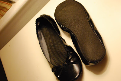 I carry by nice shoes in a canvas bag from the house to car to office. Then I switch them. So I’m perpetually switching from flats or wellies to heels. I’m wearing a pair of Old Navy flats now but they are about ready to go bye-bye. So I was excited to receive a pair of Kushyfoot’s Flats-to-Go portable ballet flats.