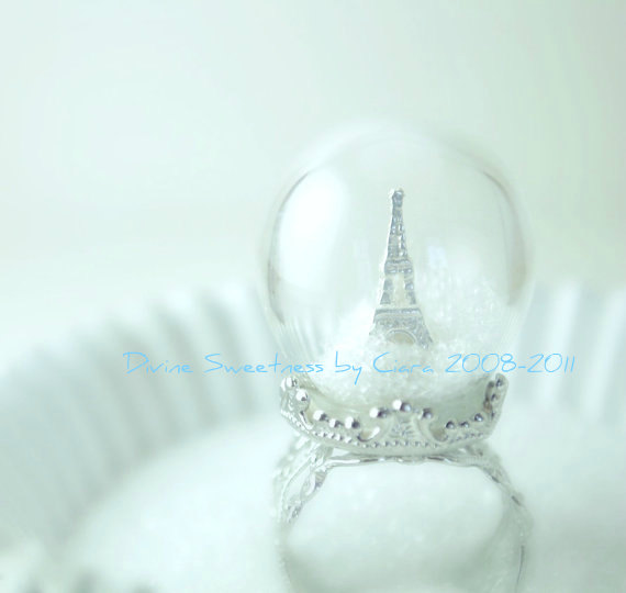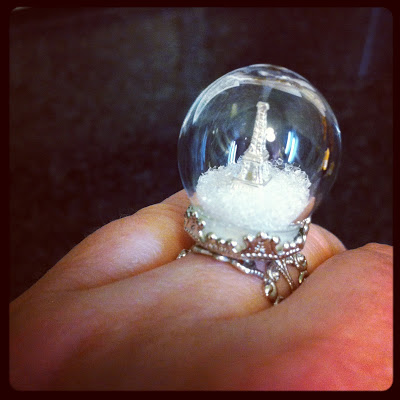 It’s the “Winter in Paris” snow globe ring from DIVINEsweetness on Etsy. And I knew I had to have it the moment I saw it. Worth every penny and the wait to get it.