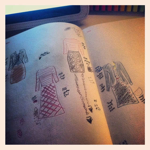 I’m pretty limited in the talent department when it comes to artistic ability (I’m much better at baking) but I’m having some fun with my basic sketches of outfits for Spring/Summer 2012. If you look closely you can see a preview of recently purchased item. I’ll share the actual pics and links soon.