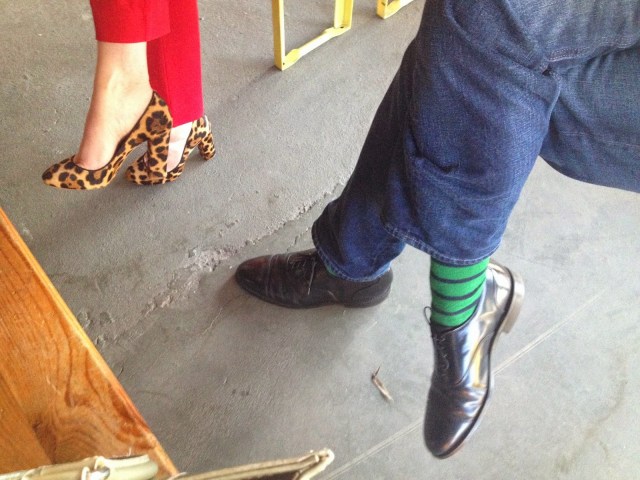 That said, here’s a small cameo shot from a recent outing. My co-worker took a picture of my shoes, the JCrew leopard Ettas, and my husband’s stripy socks. We’re co-ordinated in a “power clashing” kind of way.